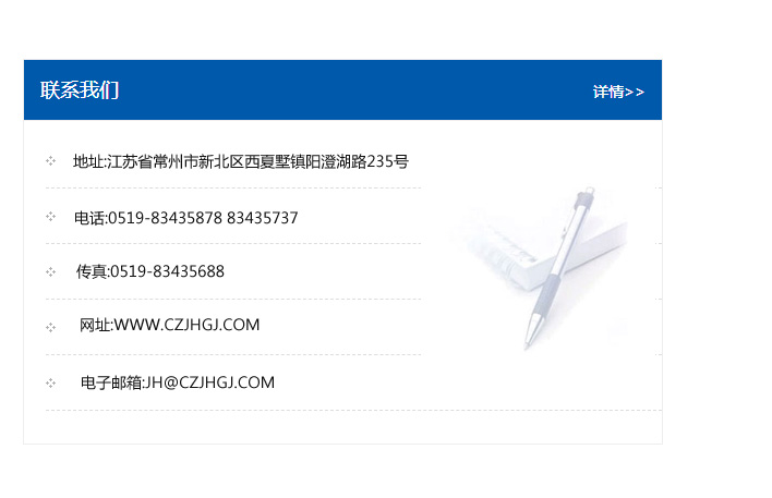 地址:常州市新北區友邦商務大廈1幢16、17層  電話:0519-85101652  傳真:0519-85112595  郵編:213022  網址:www_cz-jiayue_cn.lmm-zc.com  郵箱:xiajifengaa@163.com